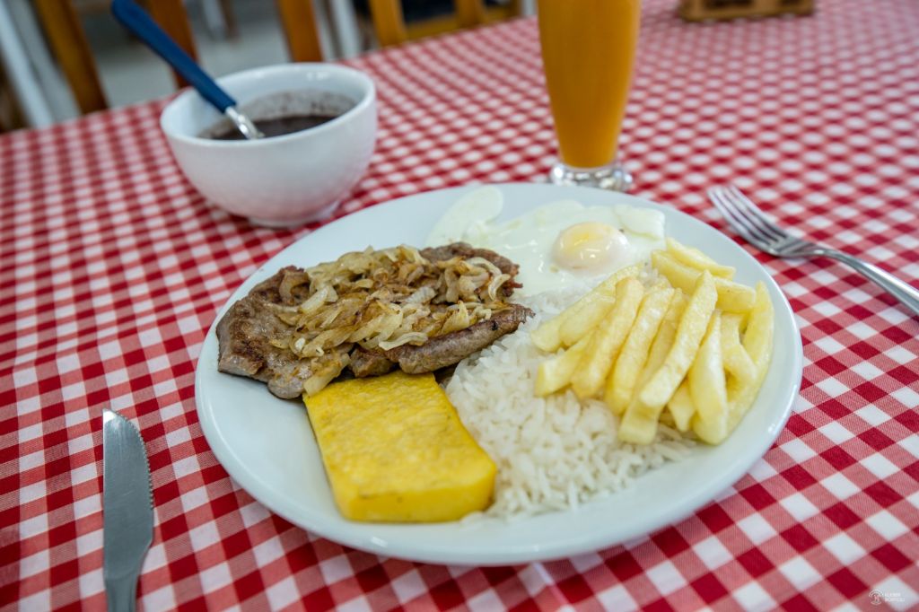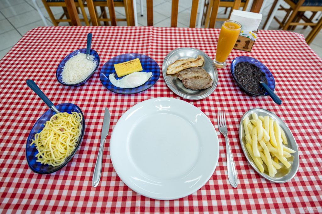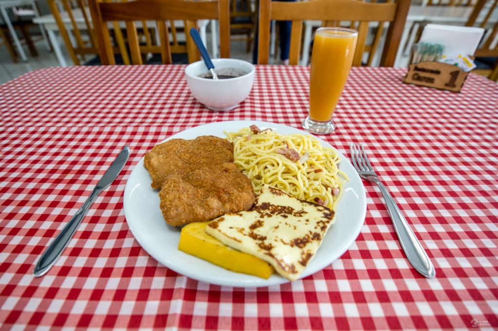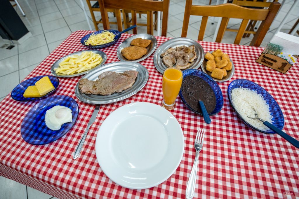 "Buffet de pratos quentes e saladas com bifes a la carte. Três opções de almoço. Prato feito, almoço com uma carne e Almoço com variedade de bifes. Bom custo benefício."