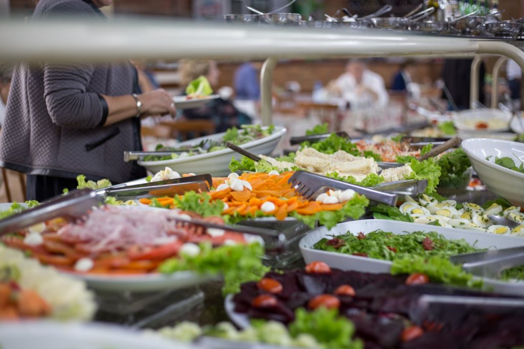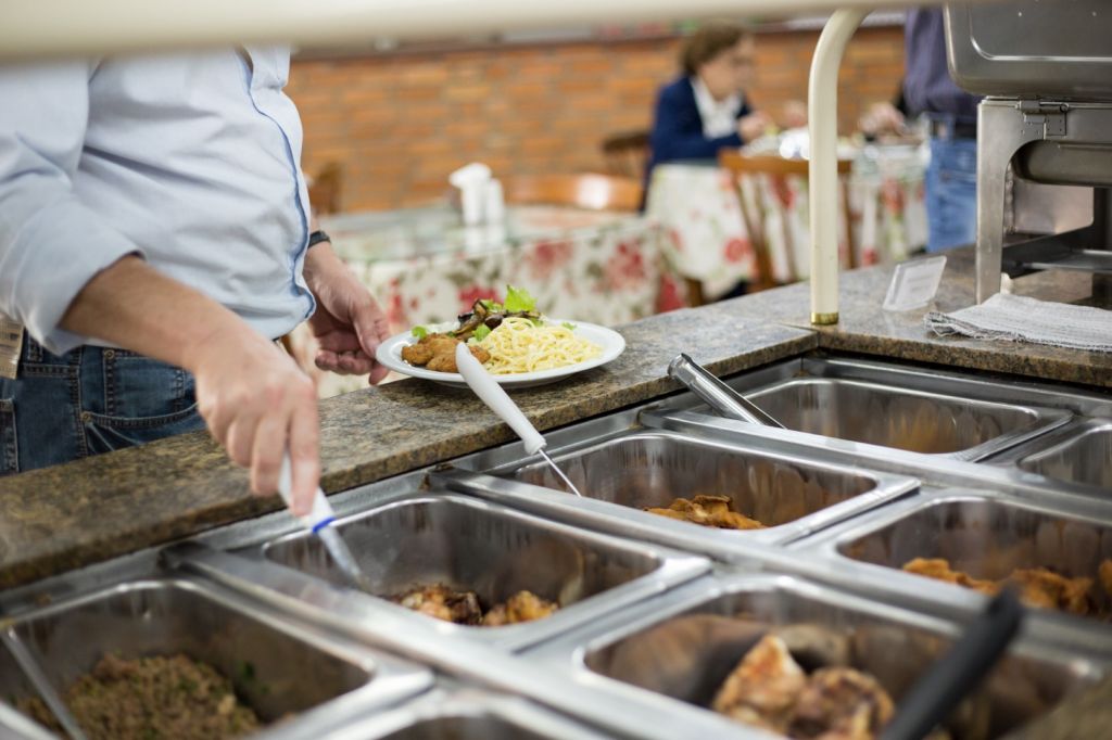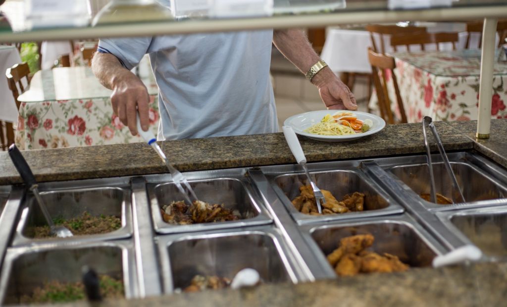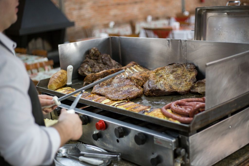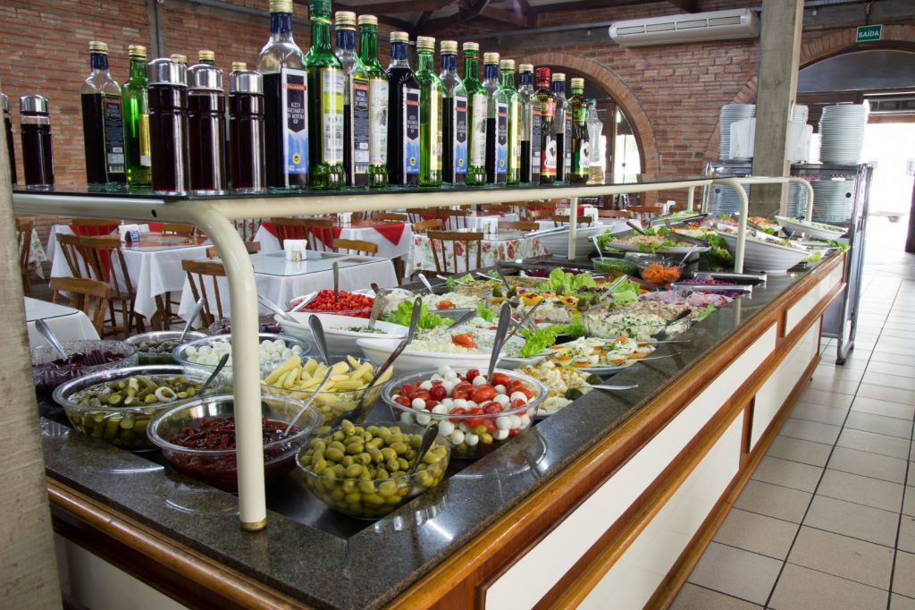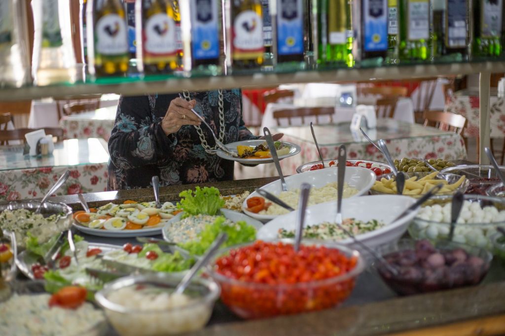 A cozinha caseira apurada no buffet variado e chamativo em ambiente espaçoso de rancharia com lareira central.