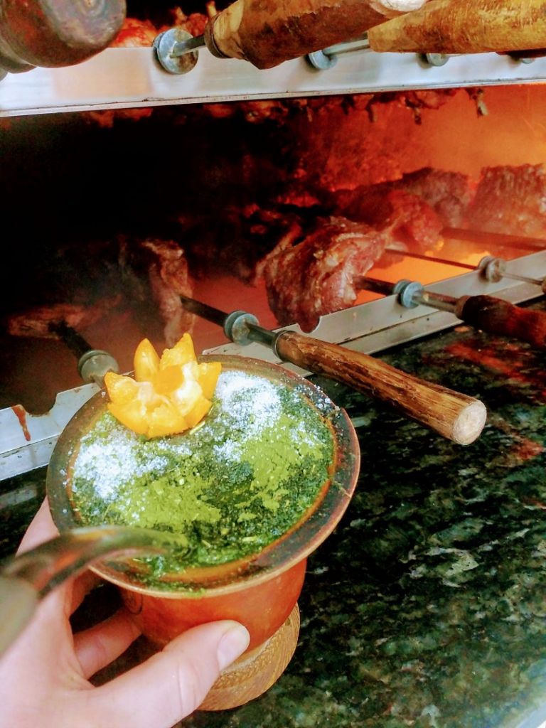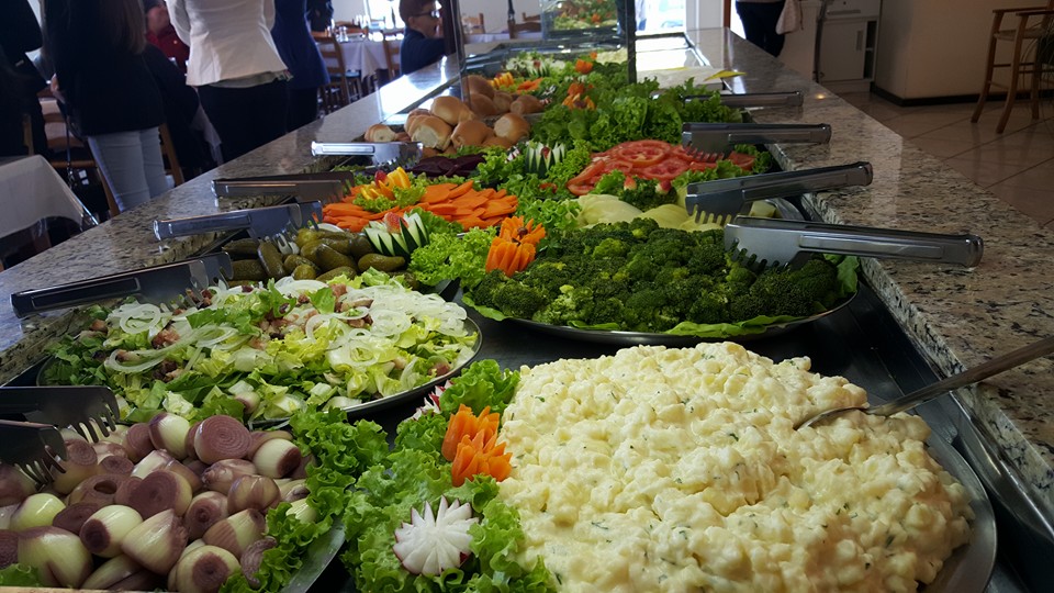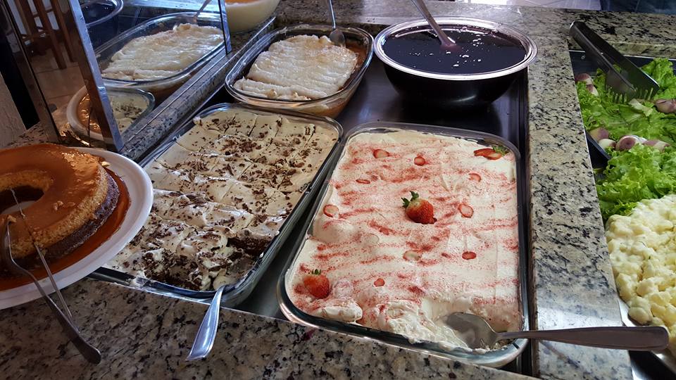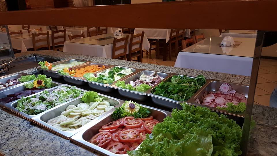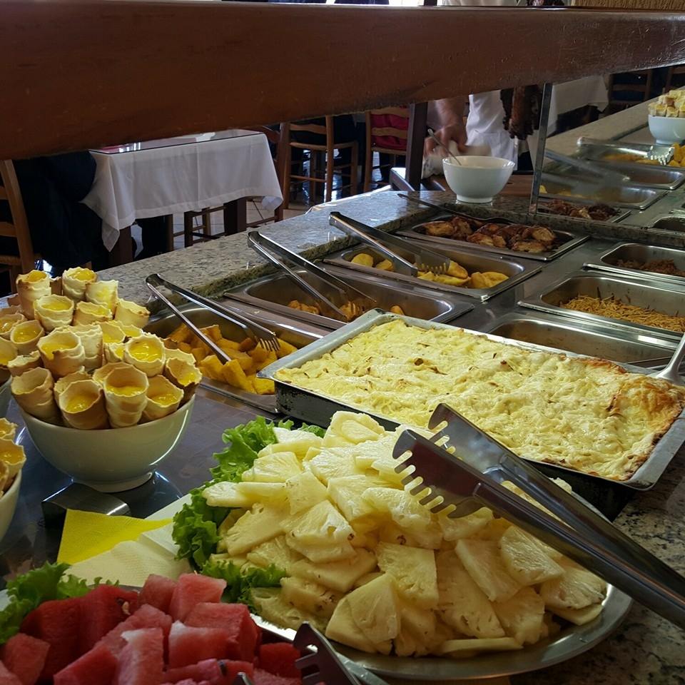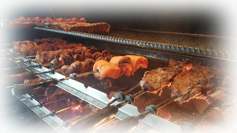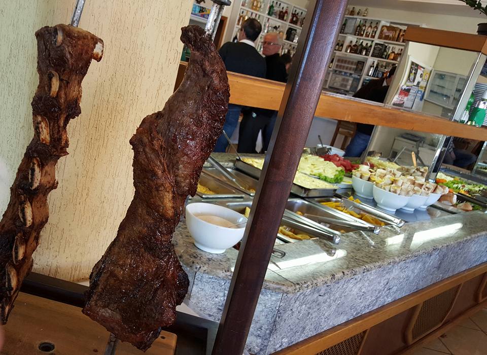 Restaurante com excelente variedade em buffet. Serve carnes no espeto.